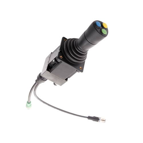 Der 2-achsige CAN-Bus Joystick beinhaltet 2 Taster proportional, in den Farben grün und gelb, sowie ein schwarz-weiß Taster.