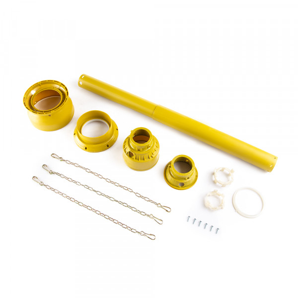 Der Gelenkwellenschutz besteht aus zwei Schutzköpfen, mit dem jeweils dazugehörigen Rohr, und wird am Gleitring eingehakt und festgeschraubt. Der Gleitring wird in die Laufrille der Gabel eingesetzt, und ermöglicht dass sich der Schutz nicht mit der Gelenkwelle mit drehen kann, wenn er durch die Ketten, die am Fahrzeug fest gemacht werden, gehalten wird.